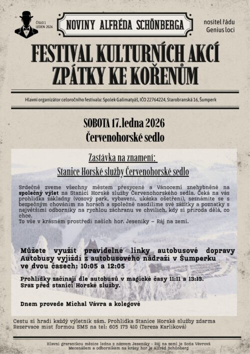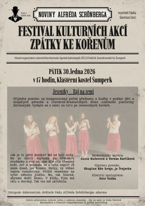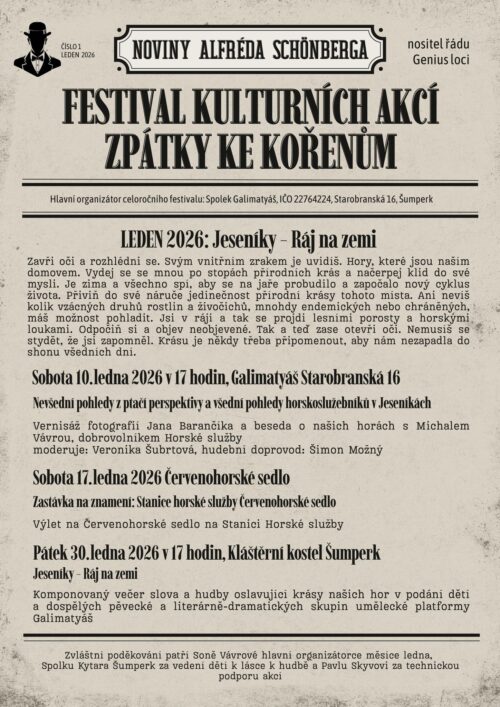 Je nám velkou ctí, že se naše prostory propůjčí projektu Alfréda Schönberga, patrona a mecenáše města Šumperk, a že zde úderem lednových měsíců vznikne celoroční festival Zpátky ke kořenům, který spojuje město s jeho historií a navrací mu sílu proudící pod povrchem jeho ulic....